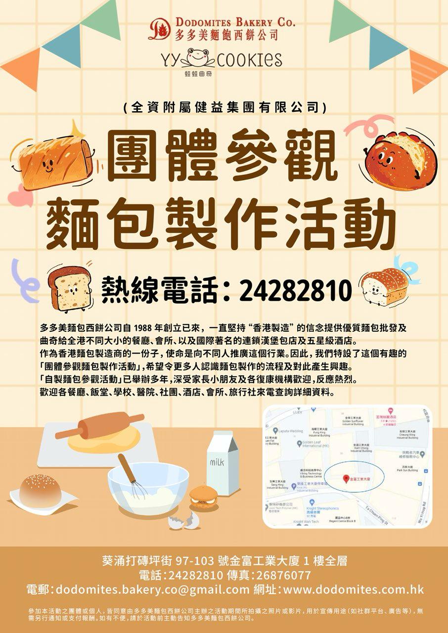 多多美麵飽西餅公司創立自1988年,二十多年來,經過公司仝人的不斷努力及同業先進的指導和支持,由一間小小的門市發展成為可提供優質麵包批發給全港九新界餐廳、酒樓、會所、還有國際著名的連鎖漢堡包店及五星級酒店。為使公司的業務多元化,多多美麵飽西餅公司除了經營麵包西餅批發生意之外,亦發展了餐廳生意,還設有深受家長小朋友及各復康機構歡迎的「自製麵包參觀活動」,務求令每位參觀者都能盡興而歸。歡迎各餐廳、飯堂、學校、醫院、社團、酒店、會所、旅行社來電查詢詳細資料。